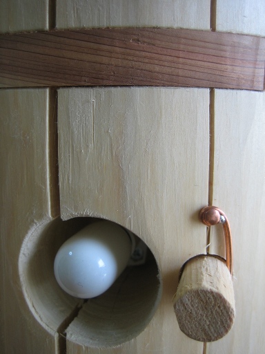 ヒノキの丸太のフロアランプです。未乾燥なので割れが入りますが、つややかで、強い香りがあります。 電球の横に突き出ている棒を回すとオン/オフします。